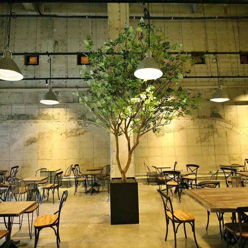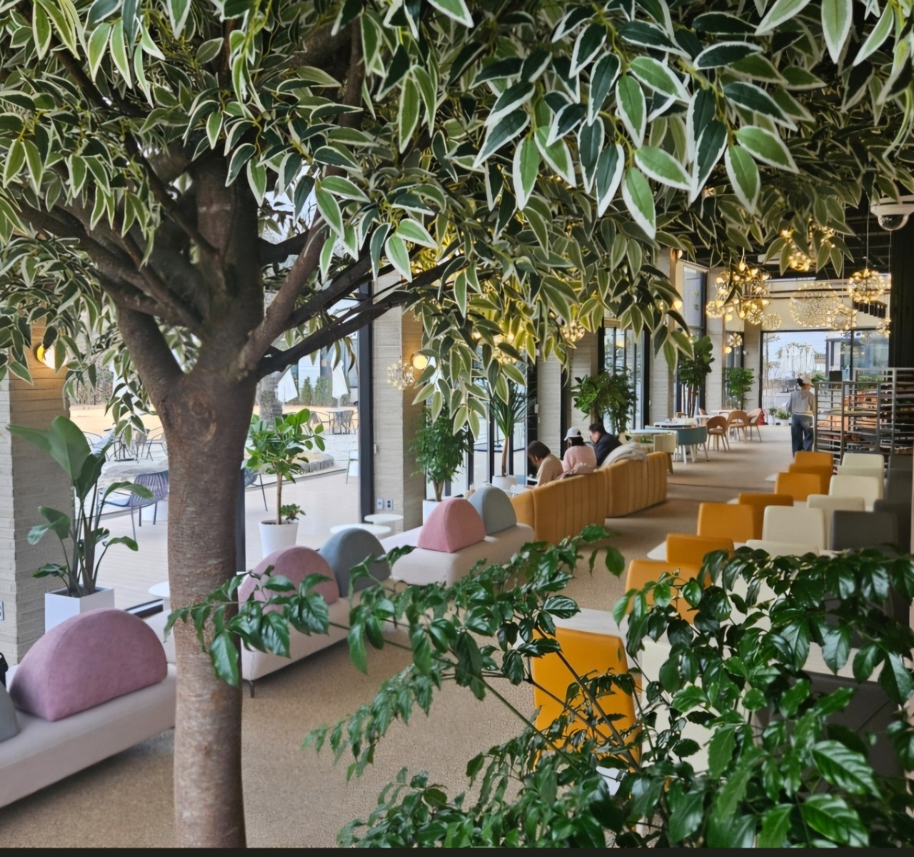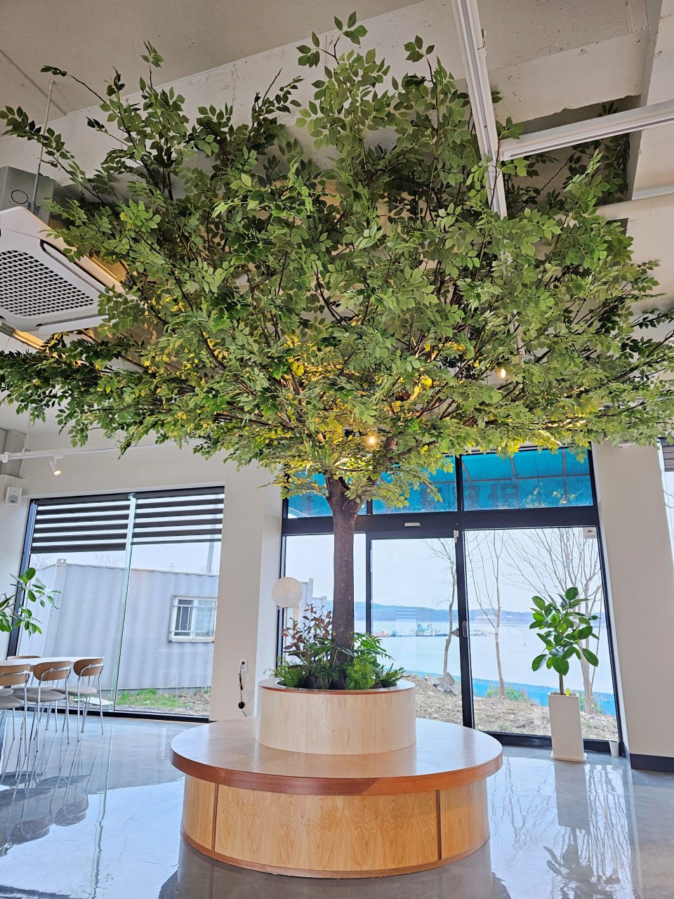 카페 내부의 인조나무들은 천장 높이를 고려해 제작된 큰 규모의 작품들이 많아, 들어서는 순간 촬영 스튜디오를 보는 듯한 생생한 분위기가 느껴져요. 자연광이 잘 들어오는 구조라 인조나무 특유의 반짝임도 덜하고, 전체적인 색감과 디테일이 자연과 거의 유사해서 방문자들이 “이거 진짜 아니야?”라고 물어볼 정도라고 해요.