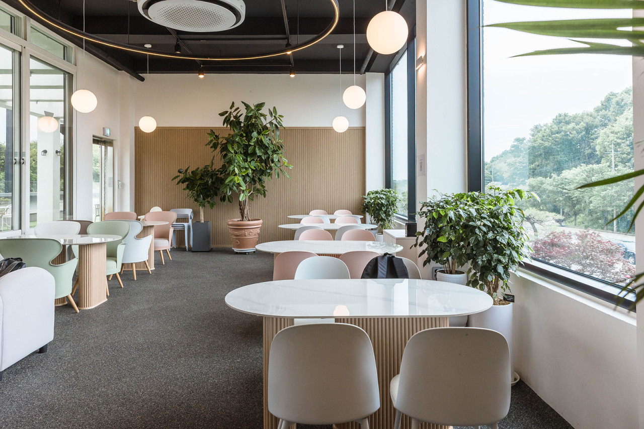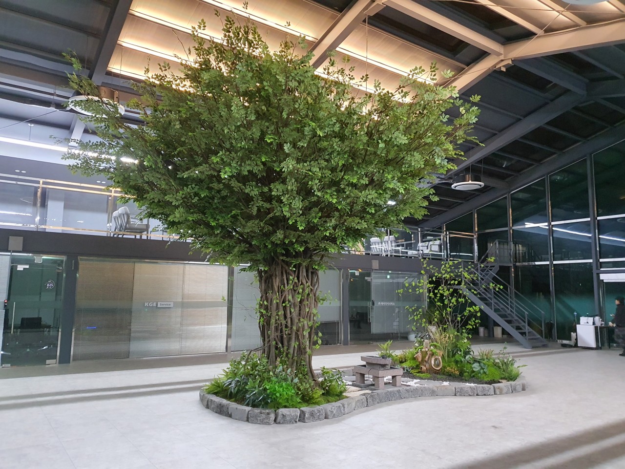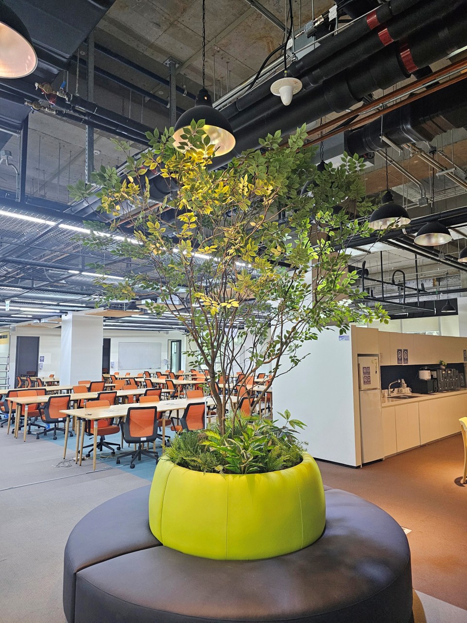 카페 내부의 인조나무들은 천장 높이를 고려해 제작된 큰 규모의 작품들이 많아, 들어서는 순간 촬영 스튜디오를 보는 듯한 생생한 분위기가 느껴져요. 자연광이 잘 들어오는 구조라 인조나무 특유의 반짝임도 덜하고, 전체적인 색감과 디테일이 자연과 거의 유사해서 방문자들이 “이거 진짜 아니야?”라고 물어볼 정도라고 해요.